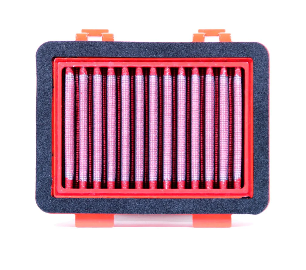 BMC Air Filters are manufactured using a proprietary molding process that yields a truly seamless part. These panel / cylindrical air filter are installed in the vehicle’s original airbox to replace the OEM air filter. The characteristic red rubber is very pliable and conformable to ensure an airtight seal within your air box. Low viscosity oil soaked multi-layered cotton gauze is used to filter out particulates down to 7 microns yet overall flow is increased in comparison to OEM 10 microns paper elements. All this is covered with an epoxy coated alloy mesh to ensure protection from petrol fumes and oxidization due to air humidity.Â